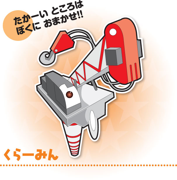 ぼく「くらーみん」!! たかいとろこが だ〜いすき! だって けしきが とっても きれい なんだもん!! まち のふうけいを 見たり、 山やうみ の しぜん をかんじたり… そんなところで さぎょう できるなんて ぼくは しあわせものだー!!